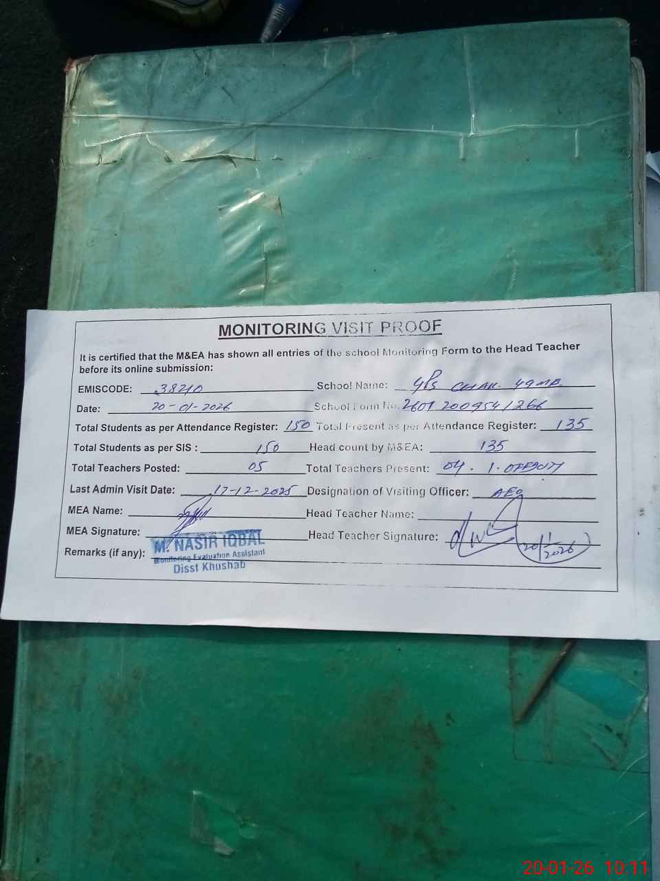 | Attendance Register | Head Teacher | MEA with School | Visit Proof |