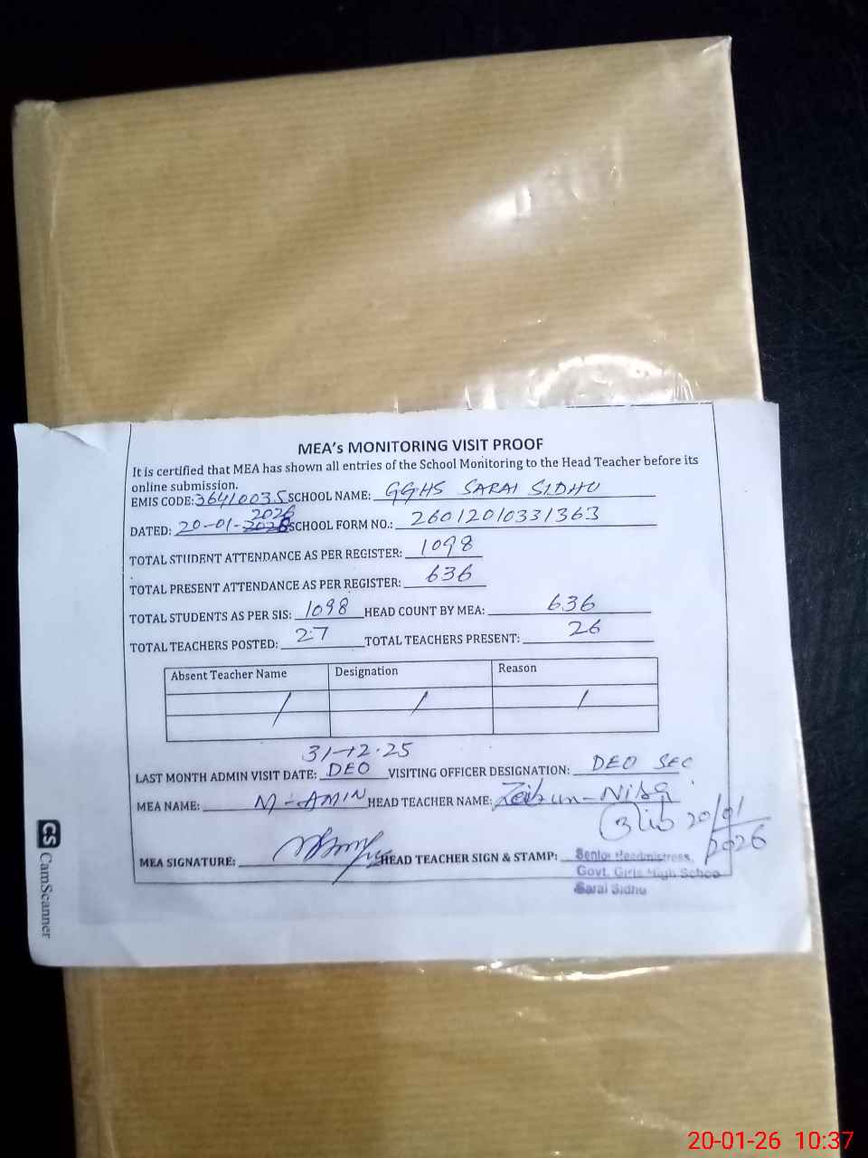 | Attendance Register | Head Teacher | MEA with School | Visit Proof |