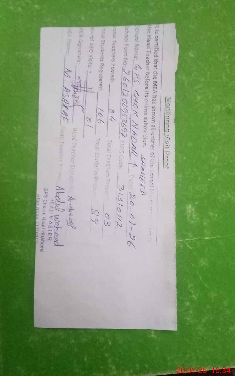 | EMIS Code: 31310112 | Name of School: GPS CHOWK NADIR SHAHEED (After Noon) | |||