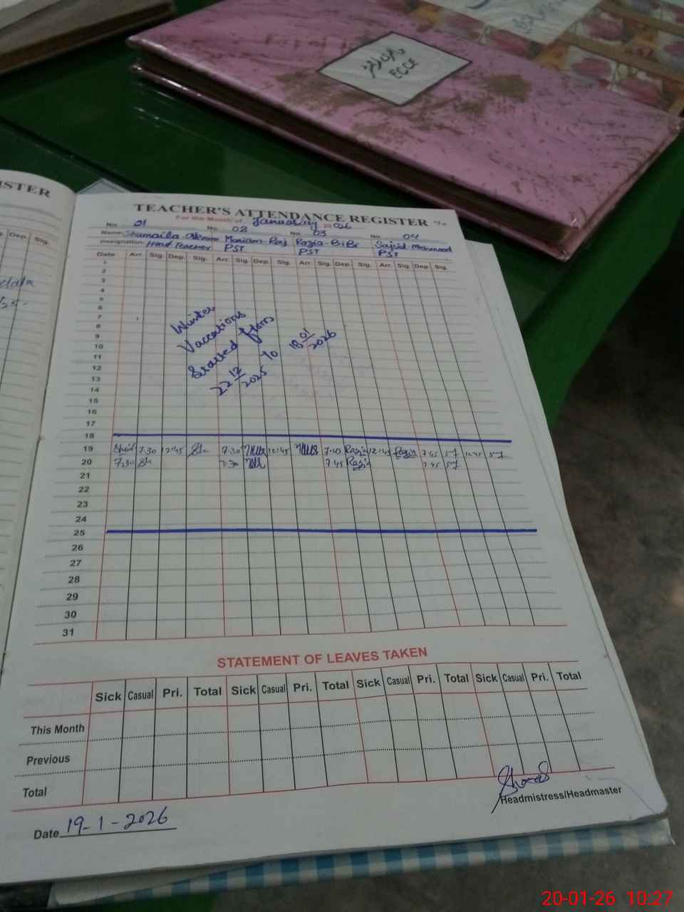 | Attendance Register | Head Teacher | MEA with School | Visit Proof |