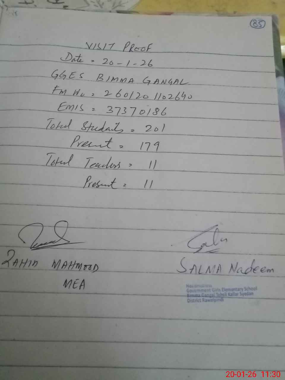 | Attendance Register | Head Teacher | MEA with School | Visit Proof |