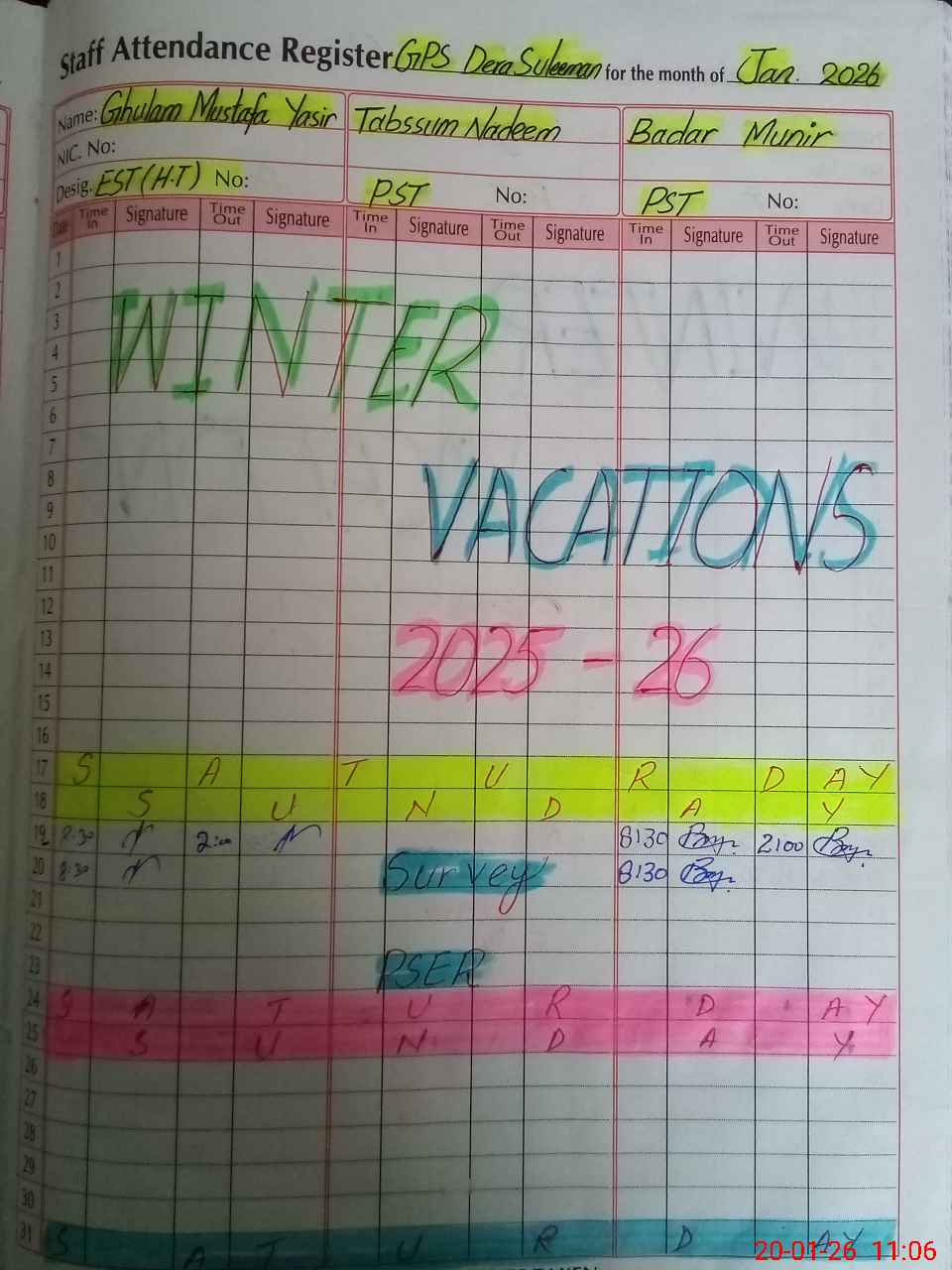 | Remarks (Use Separate Page if Required): Mr Tabssum Nadeem PST teacher on socio economic survey duty | |||||