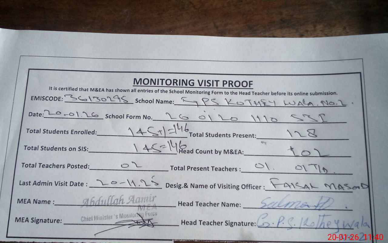 | EMIS Code: 36130295 | Name of School: GPS KOTHEY WALA NO. 2 MULTAN | |||