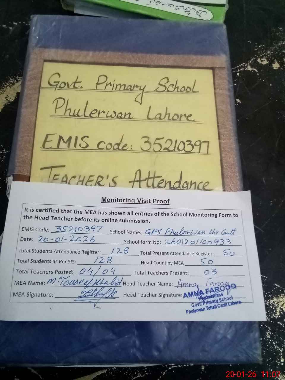 | EMIS Code: 35210397 | Name of School: GPS PHULARWAN LAHORE CANTT | |||