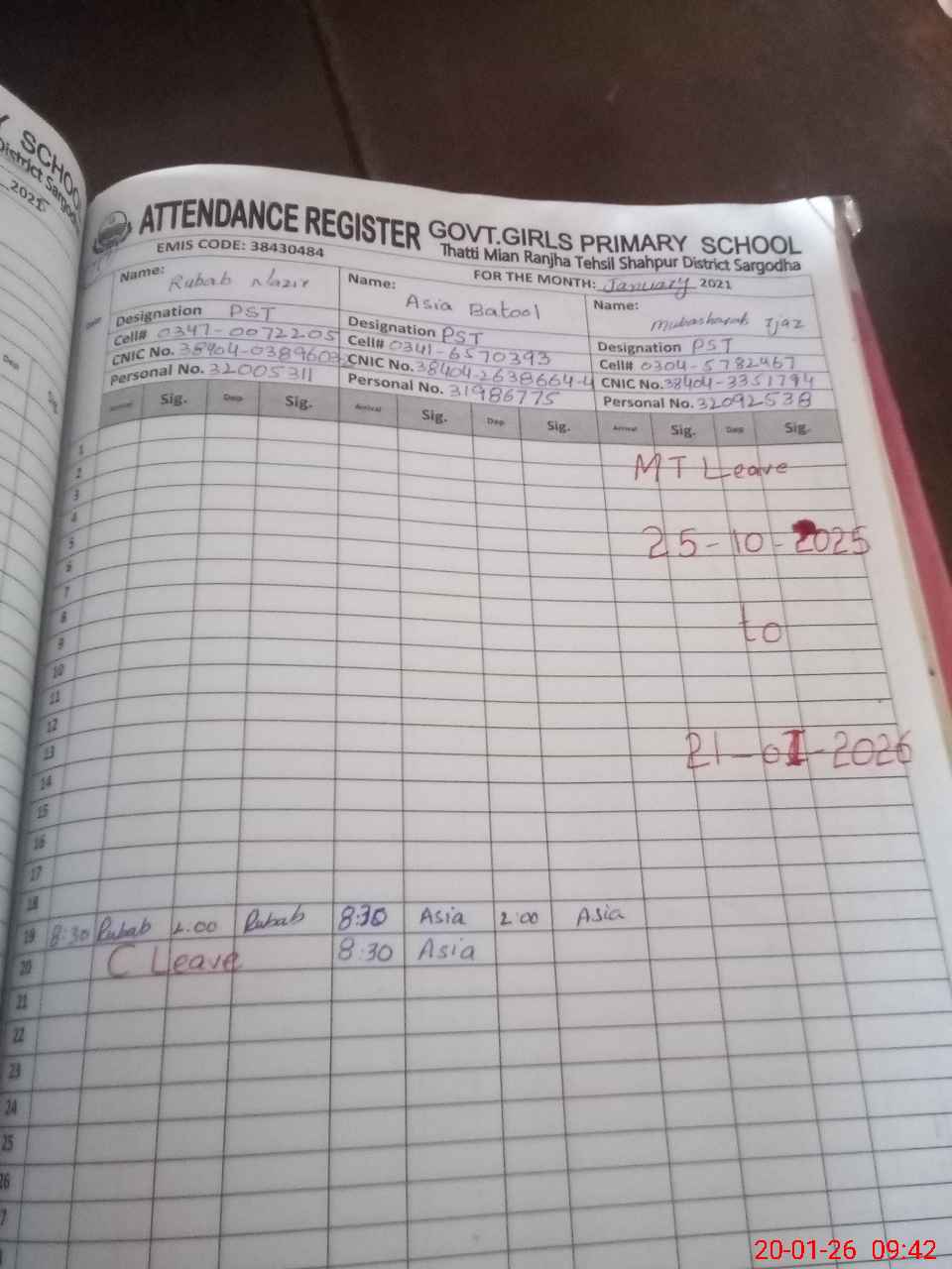 | CNIC | Full Name | Designation | R/C | Absence During Last Calender Month |
