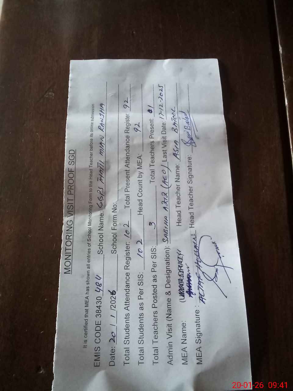 | Attendance Register | Head Teacher | MEA with School | Visit Proof |