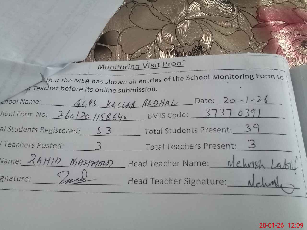 | Attendance Register | Head Teacher | MEA with School | Visit Proof |