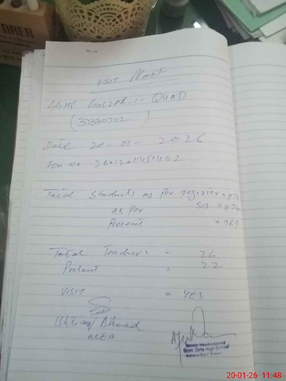 | Attendance Register | Head Teacher | MEA with School | Visit Proof |
