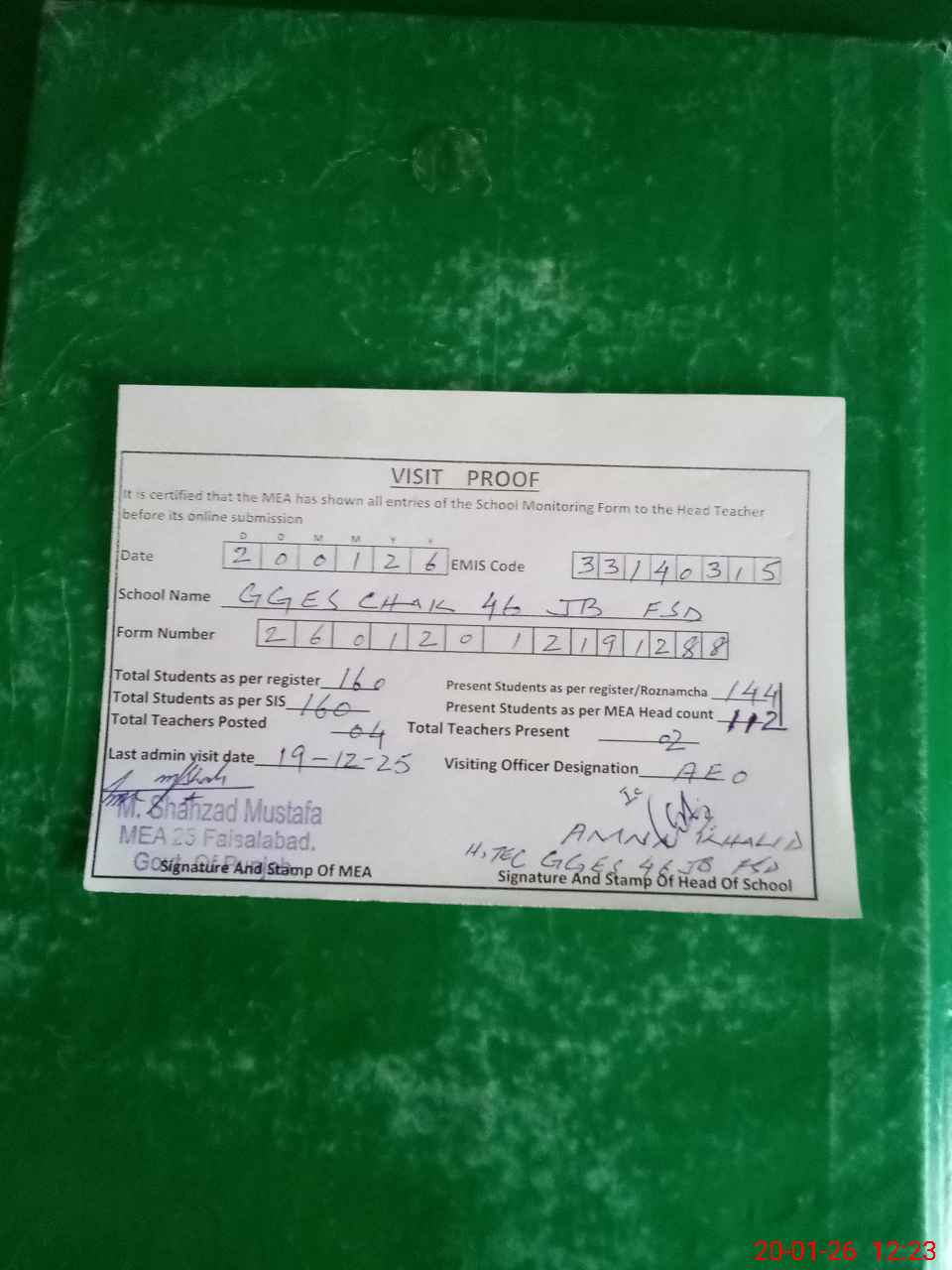 | Attendance Register | Head Teacher | MEA with School | Visit Proof |