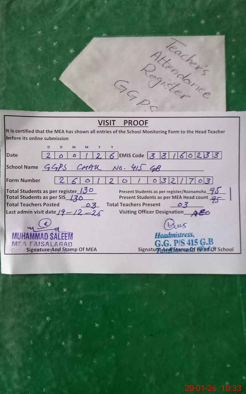 | EMIS Code: 33160233 | Name of School: GGPS CHAK 415 GB TANDLIANWALA | |||
