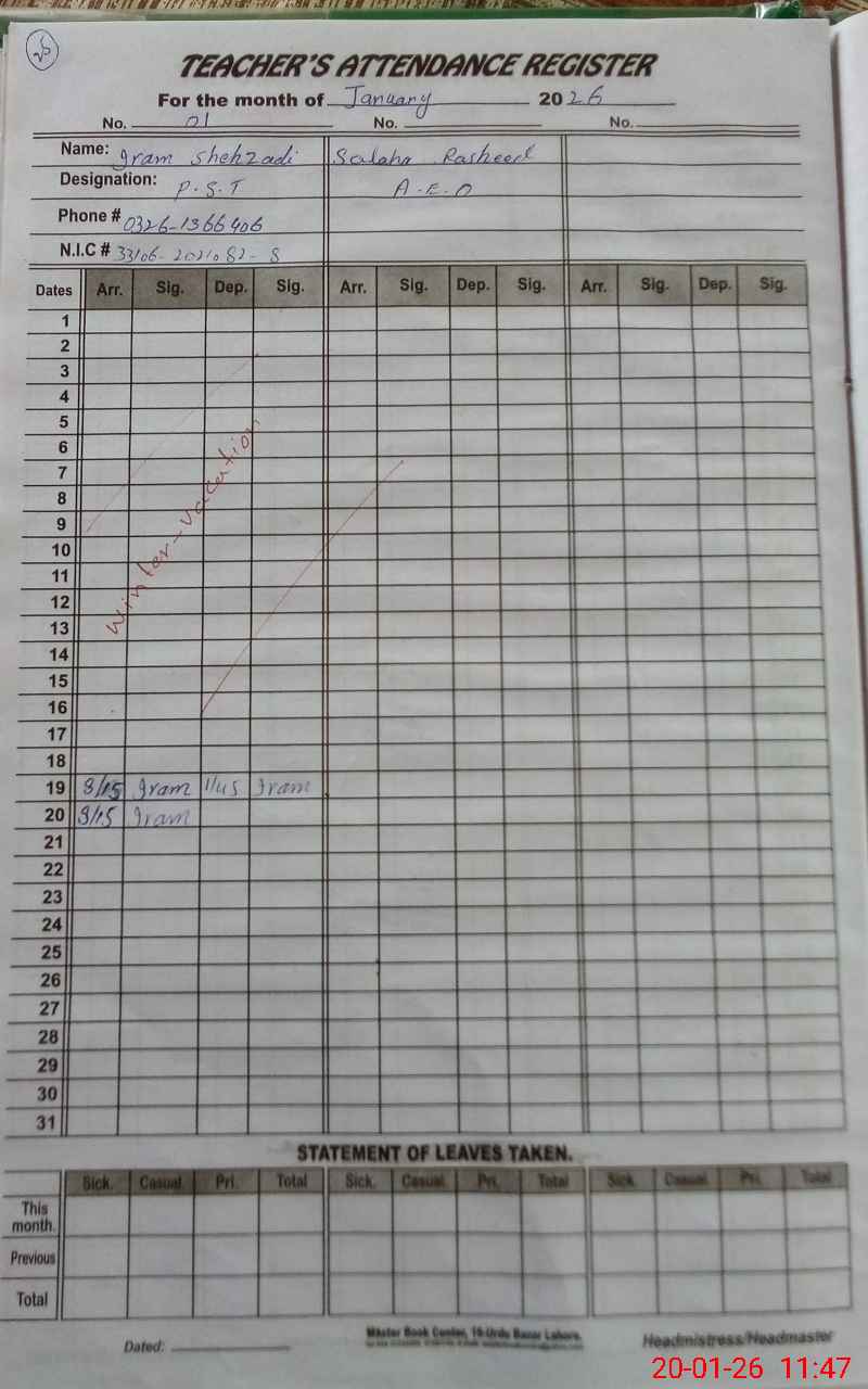 | Name: IR**** SH**** Designation: (School Headmaster's/Headmistress's) PST Phone/Cell Number: 03**** |