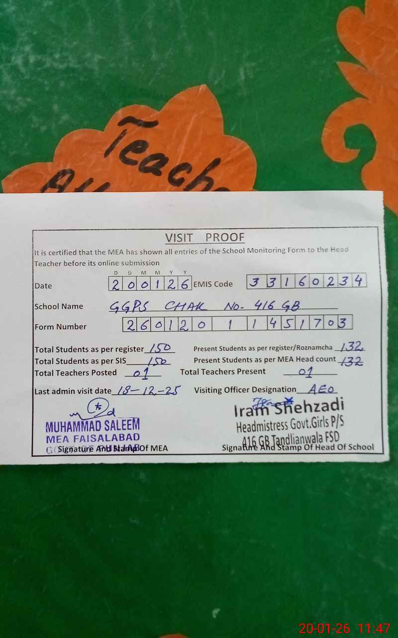 | EMIS Code: 33160234 | Name of School: GGPS CHAK 416 GB TANDLIANWALA | |||