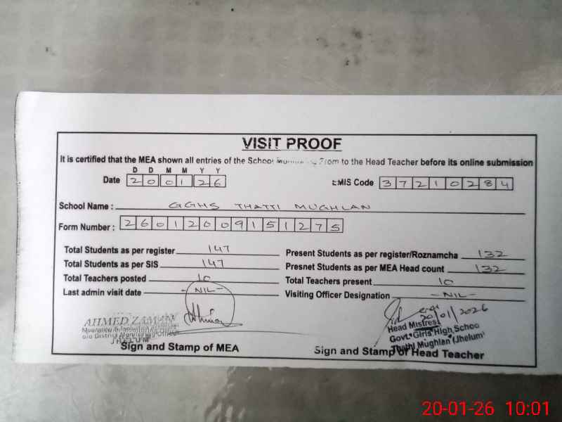 | Remarks (Use Separate Page if Required): In GGHS Thatti Mughlan non teaching staff sanctioned 06 post but only 01 Jnr Clerk post is filled and no Class IV is available | |||||