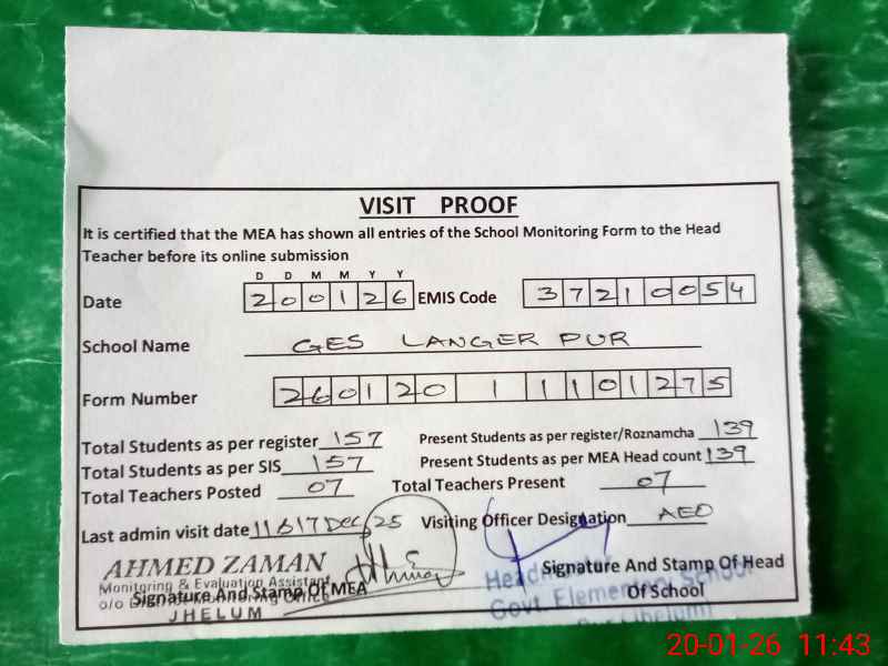 | Attendance Register | Head Teacher | MEA with School | Visit Proof |