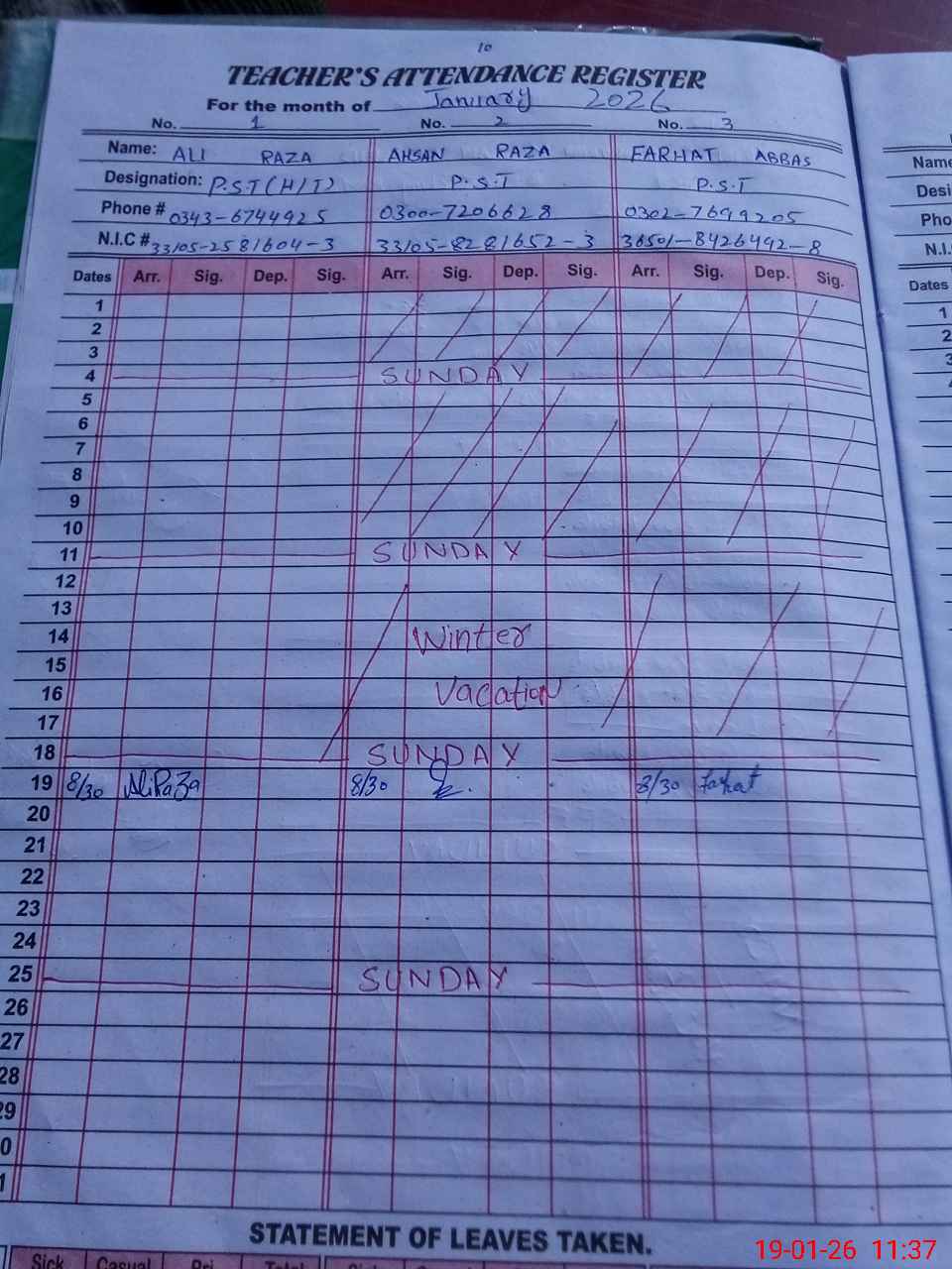 | CNIC | Full Name | Designation | R/C | Absence During Last Calender Month |