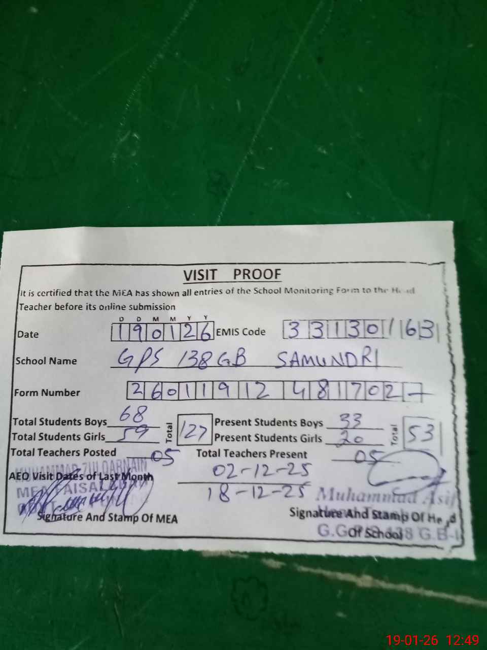 | Attendance Register | Head Teacher | MEA with School | Visit Proof |