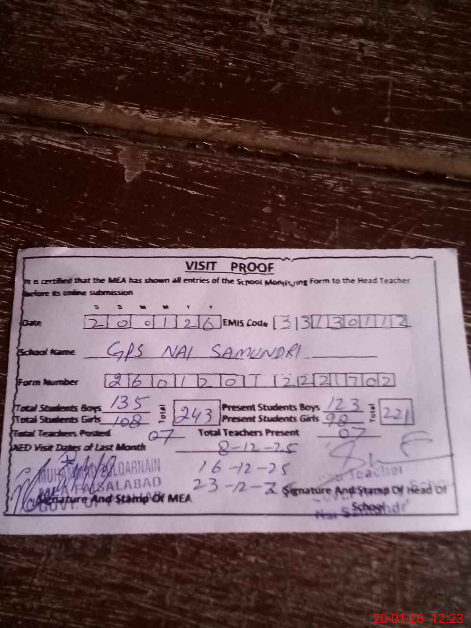 | Attendance Register | Head Teacher | MEA with School | Visit Proof |