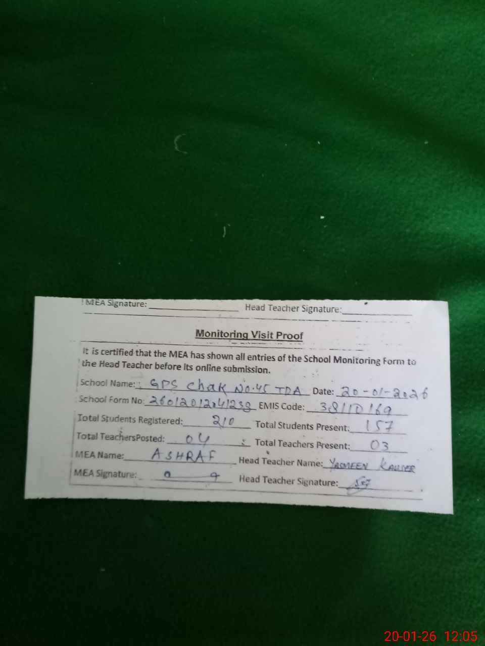 | Attendance Register | Head Teacher | MEA with School | Visit Proof |
