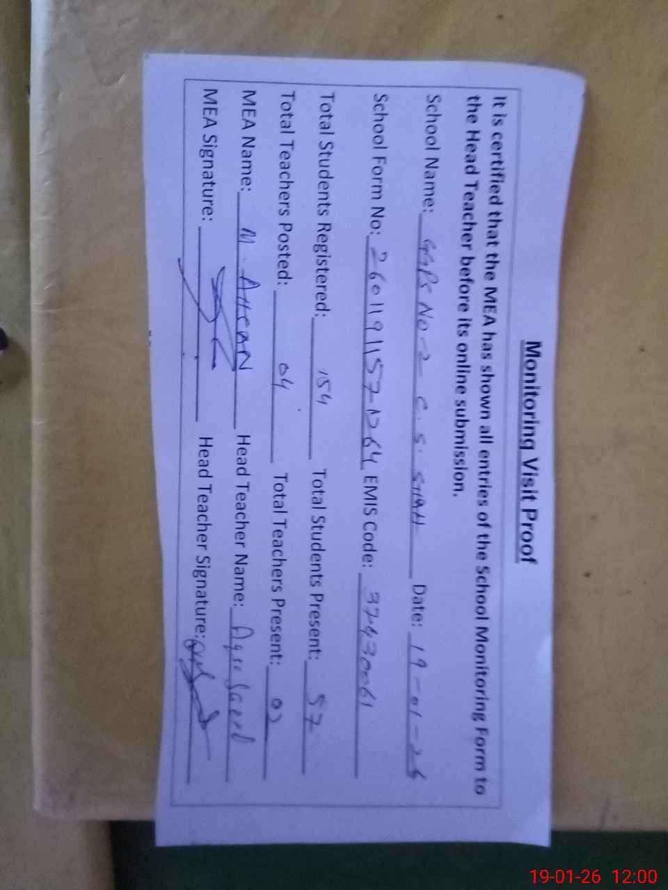 | Attendance Register | Head Teacher | MEA with School | Visit Proof |