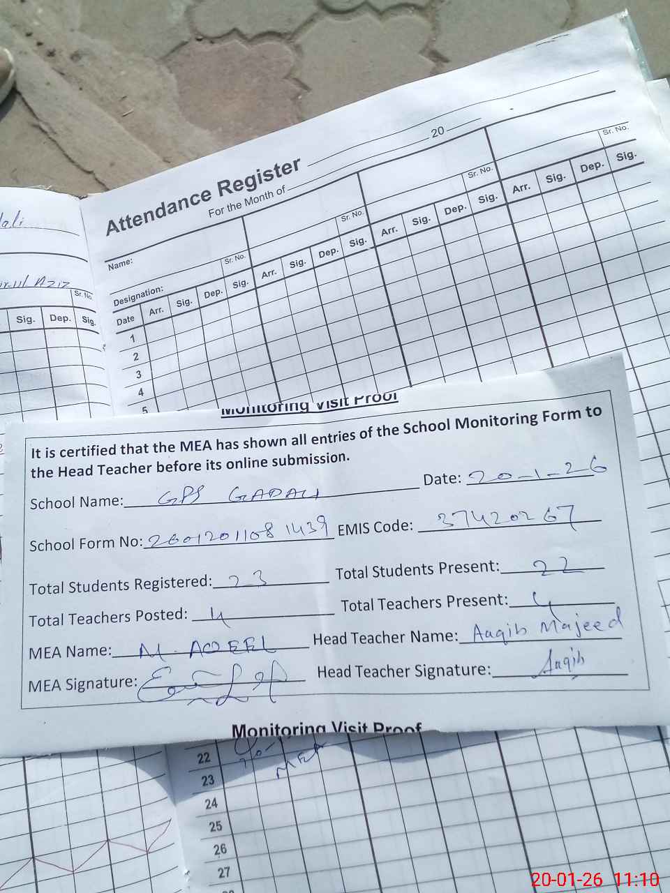 | Attendance Register | Head Teacher | MEA with School | Visit Proof |