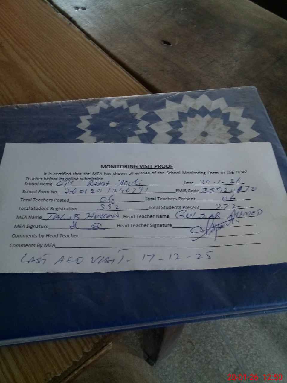 | Attendance Register | Head Teacher | MEA with School | Visit Proof |
