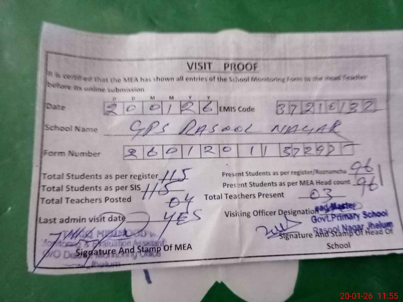 | Attendance Register | Head Teacher | MEA with School | Visit Proof |