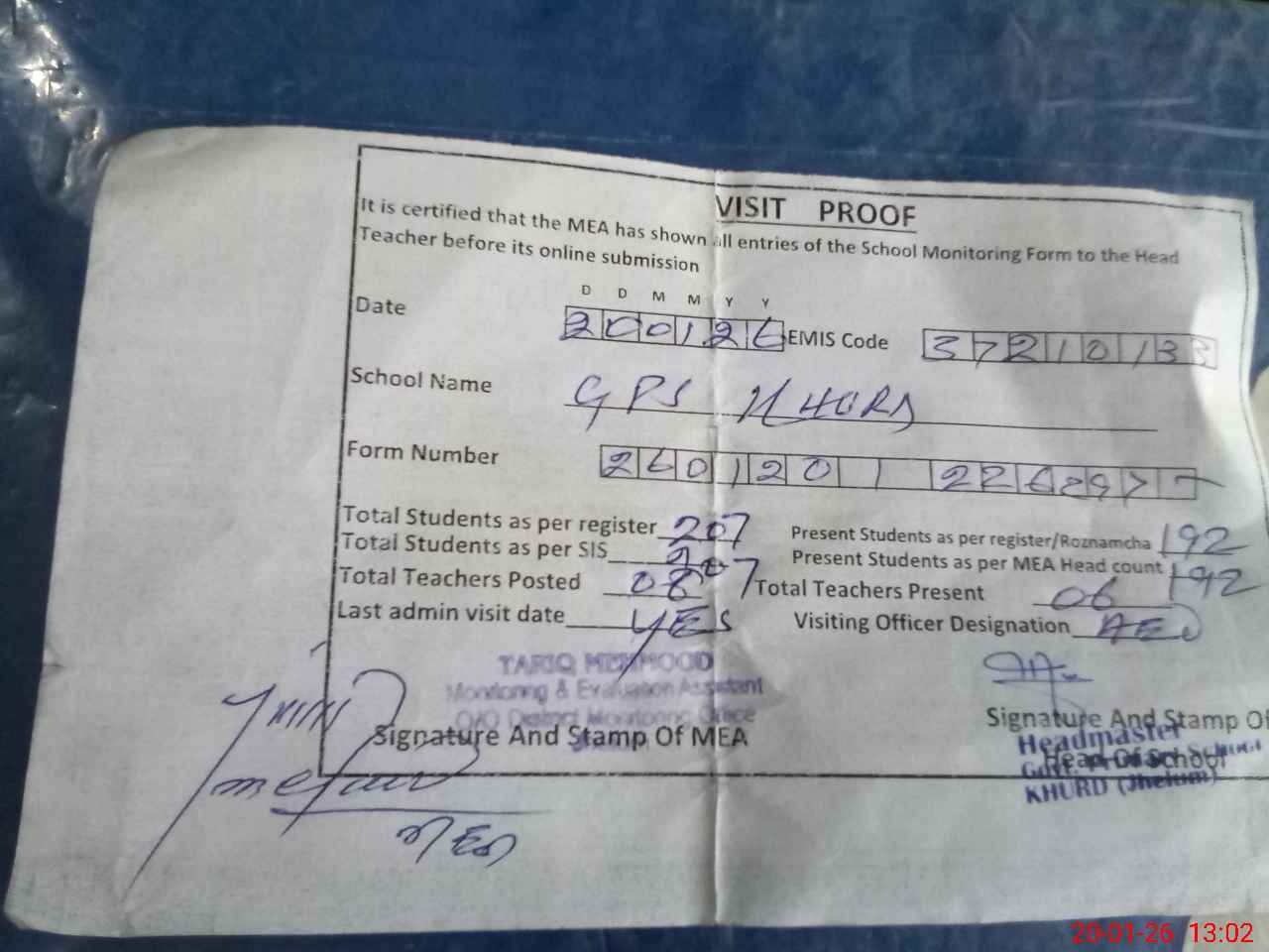 | Attendance Register | Head Teacher | MEA with School | Visit Proof |