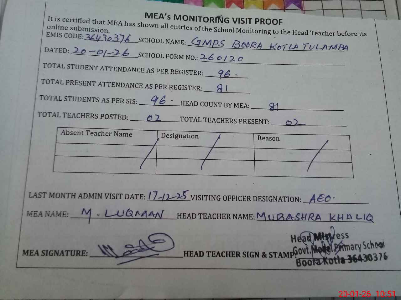 | EMIS Code: 36430376 | Name of School: GMPS BOORA KOTLA, TULAMBA | |||
