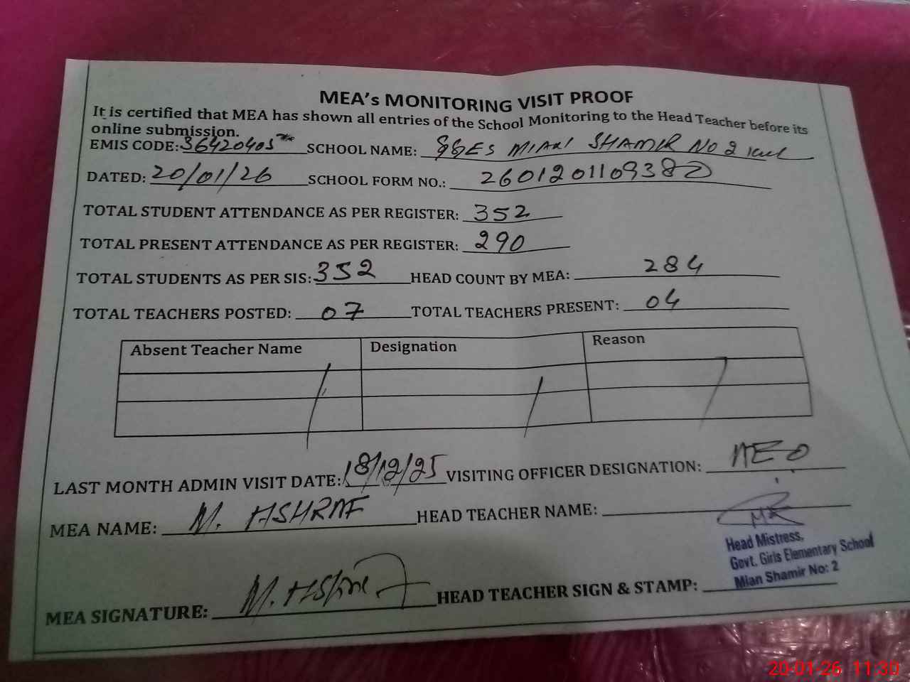 | Attendance Register | Head Teacher | MEA with School | Visit Proof |