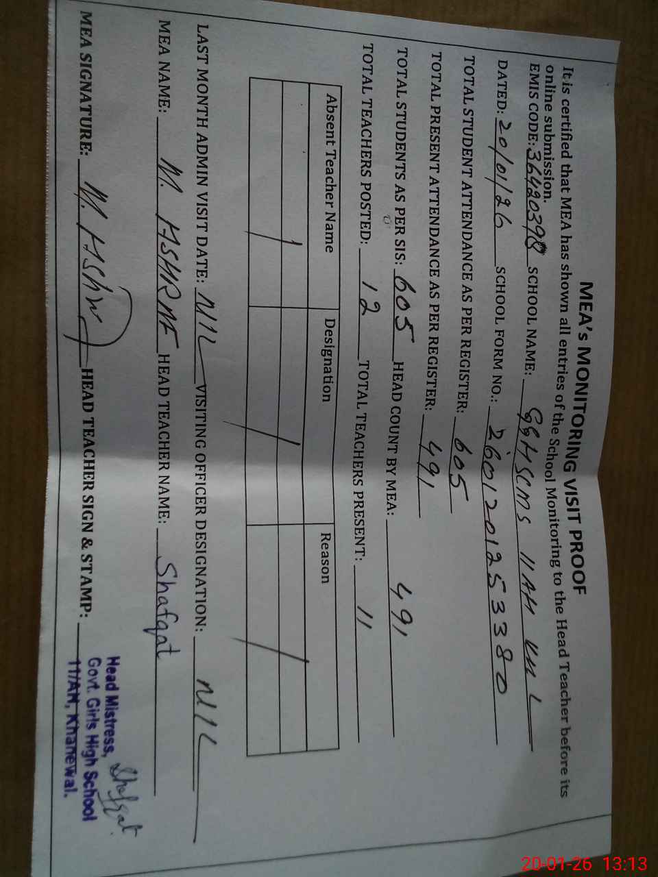 | Attendance Register | Head Teacher | MEA with School | Visit Proof |