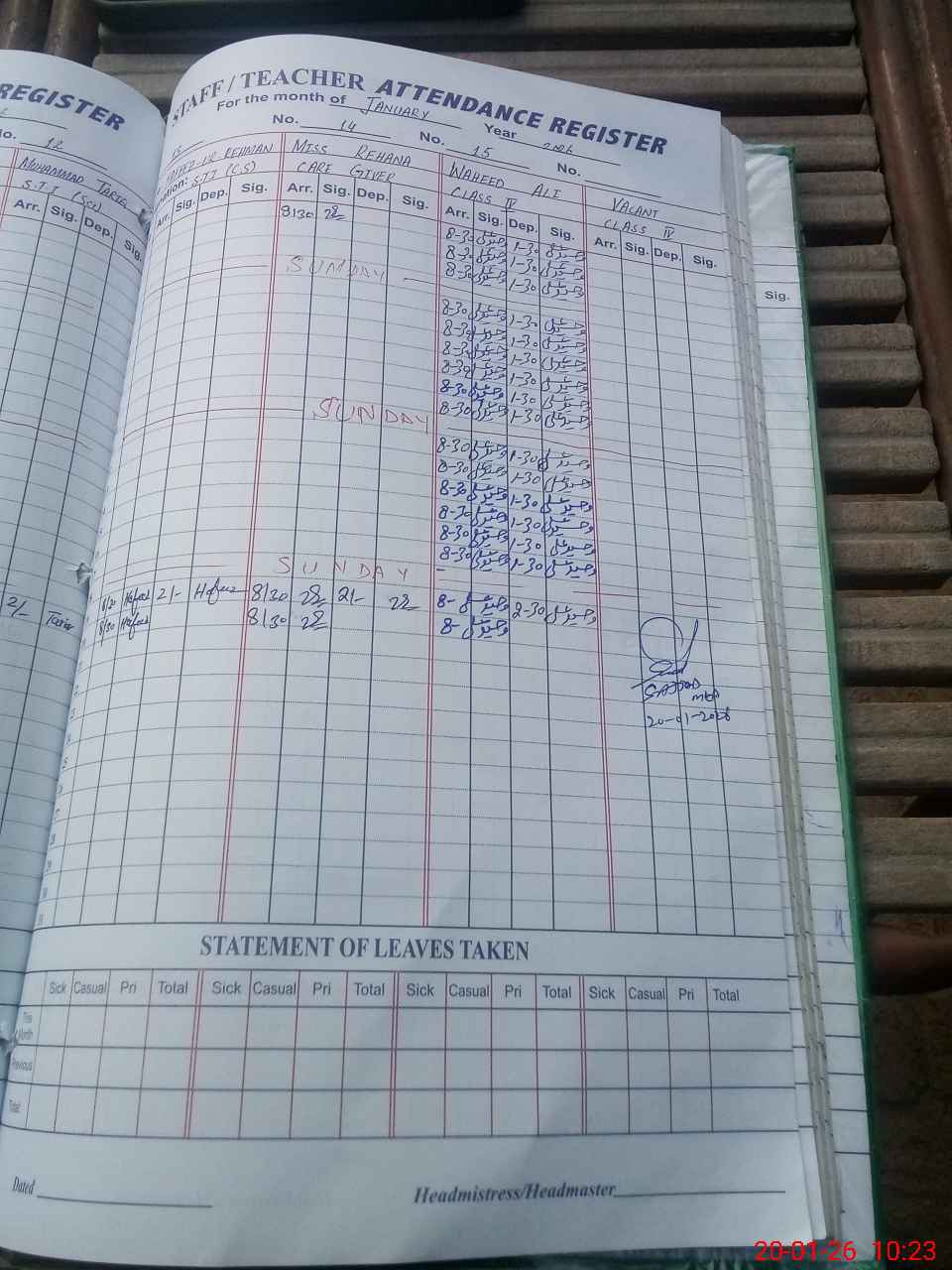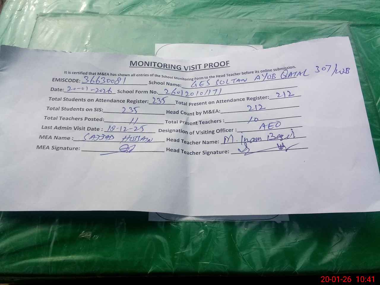 | Attendance Register | Head Teacher | MEA with School | Visit Proof |
