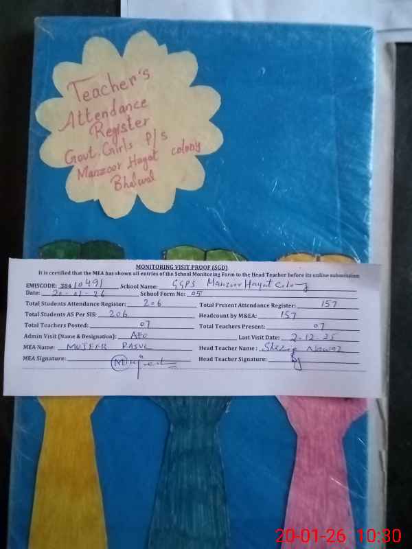 | EMIS Code: 38410491 | Name of School: GGPS MANZOOR HAYAT COLONY BHALWAL | |||