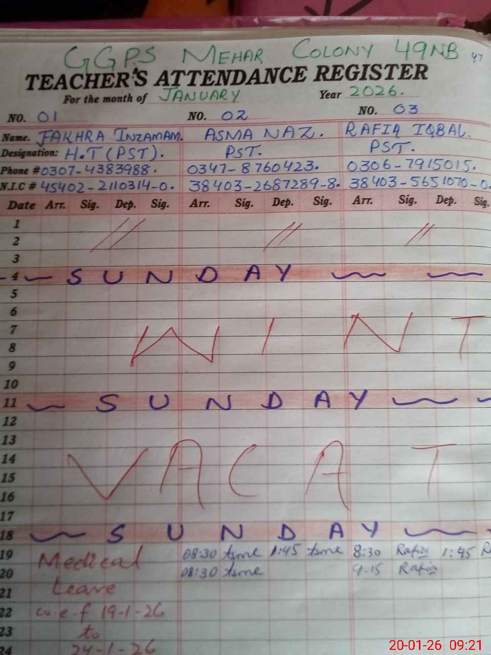| CNIC | Full Name | Designation | R/C | Absence During Last Calender Month |