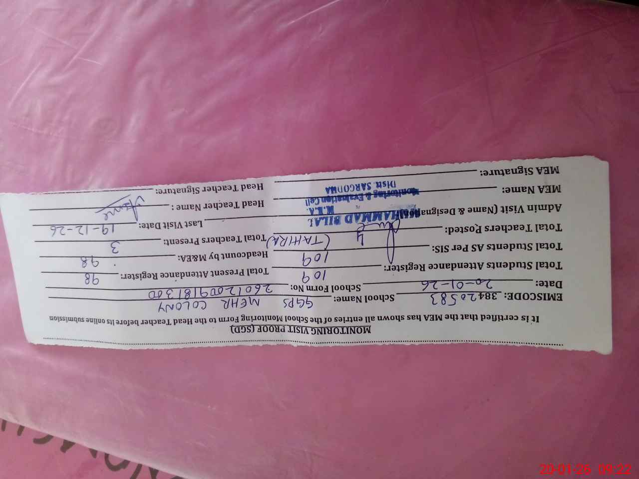 | EMIS Code: 38420583 | Name of School: GGPS MEHAR COLONY SARGODHA | |||