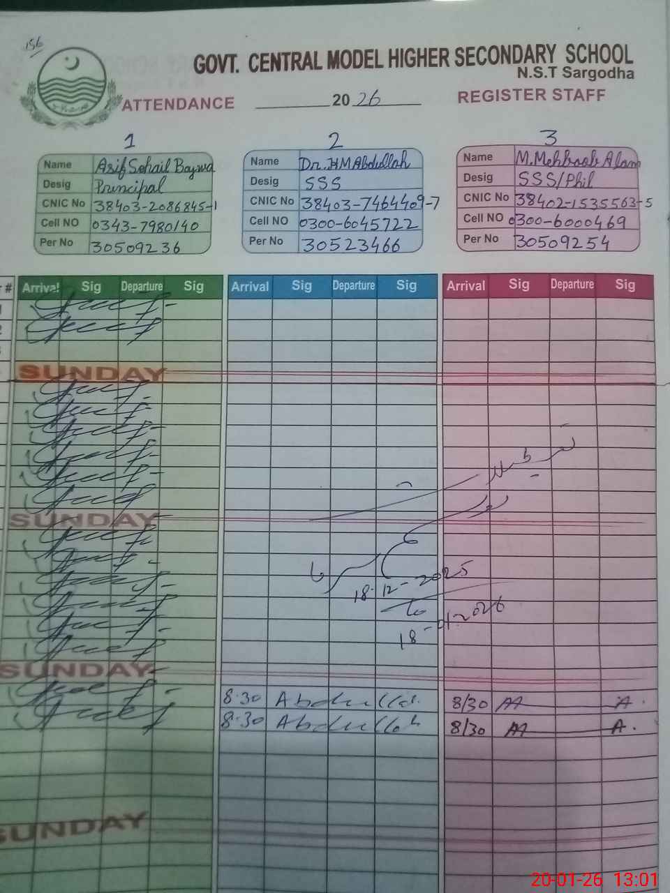 | CNIC | Full Name | Designation | R/C | Absence during last cal. month |