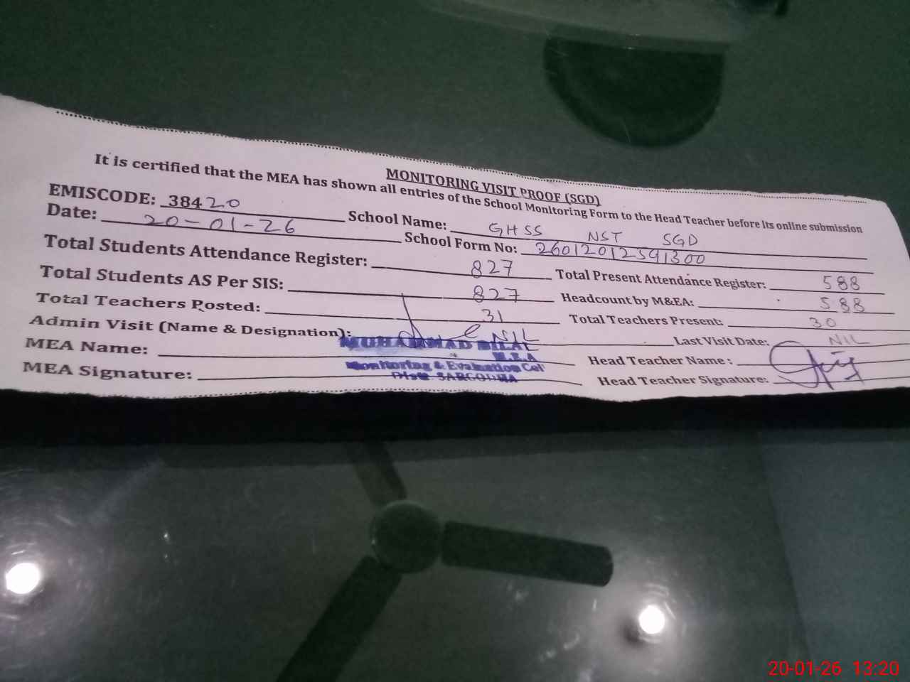| Attendance Register | Head Teacher | MEA with School | Visit Proof |