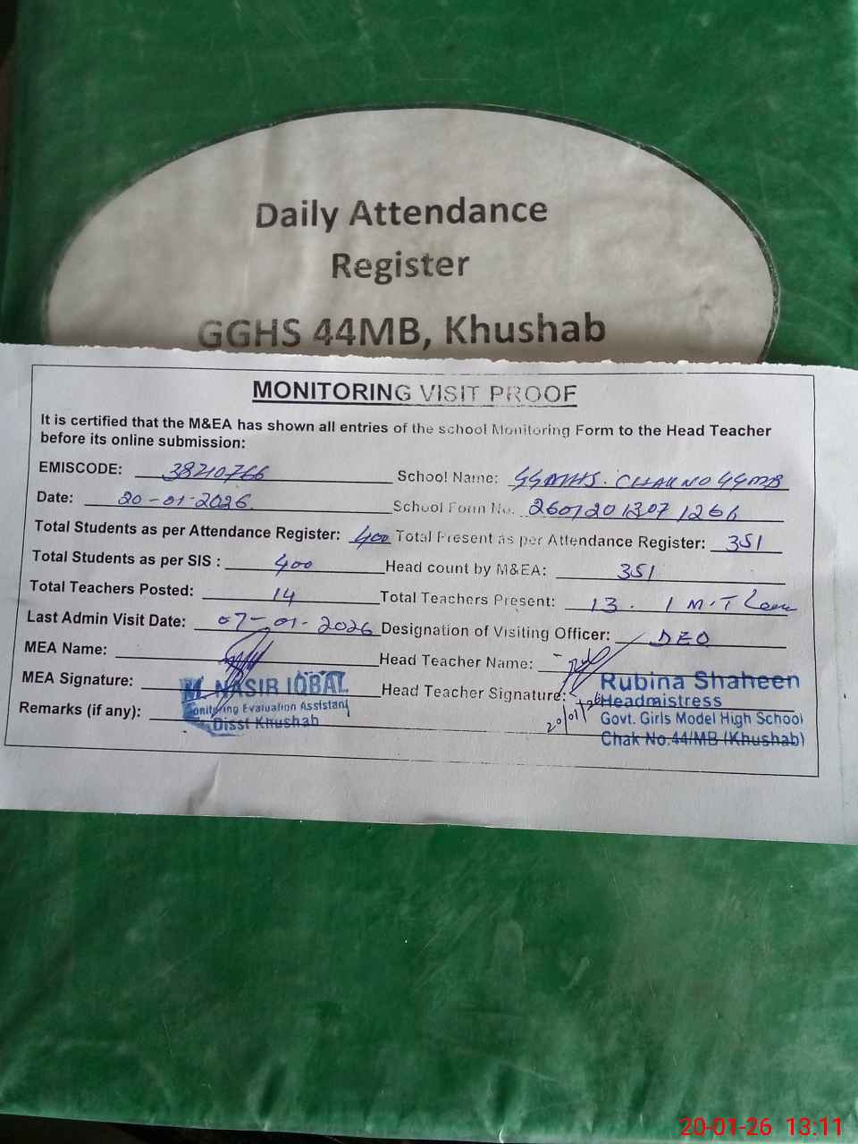 | Attendance Register | Head Teacher | MEA with School | Visit Proof |
