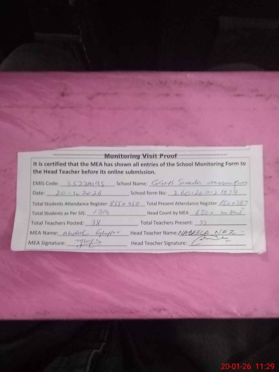 | Attendance Register | Head Teacher | MEA with School | Visit Proof |