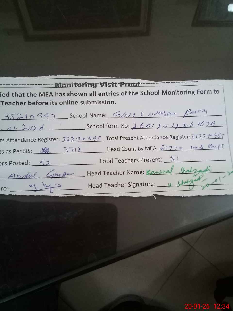 | Attendance Register | Head Teacher | MEA with School | Visit Proof |