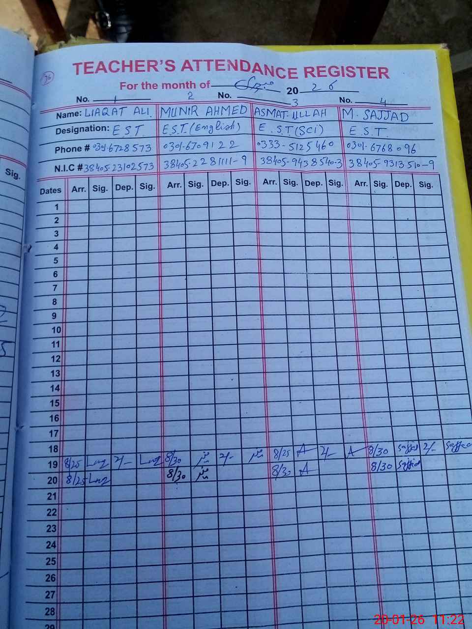 | CNIC | Full Name | Designation | R/C | Absence During Last Calender Month |