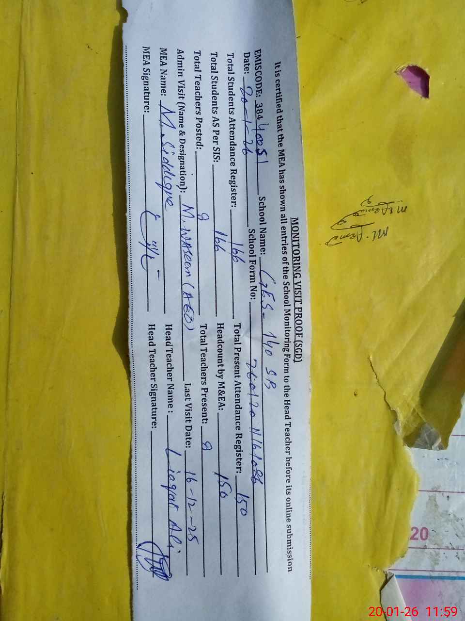 | Attendance Register | Head Teacher | MEA with School | Visit Proof |