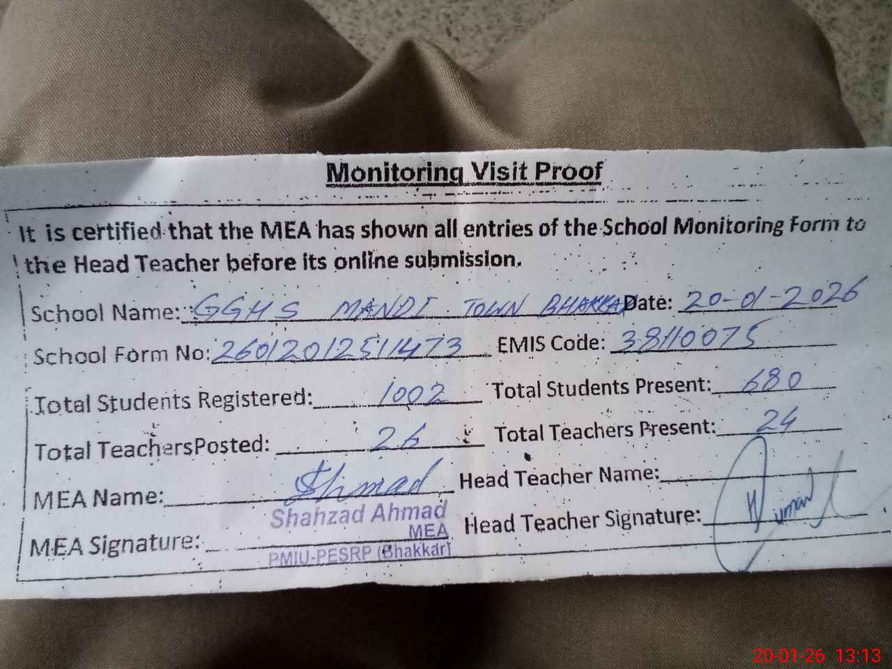 | Attendance Register | Head Teacher | MEA with School | Visit Proof |