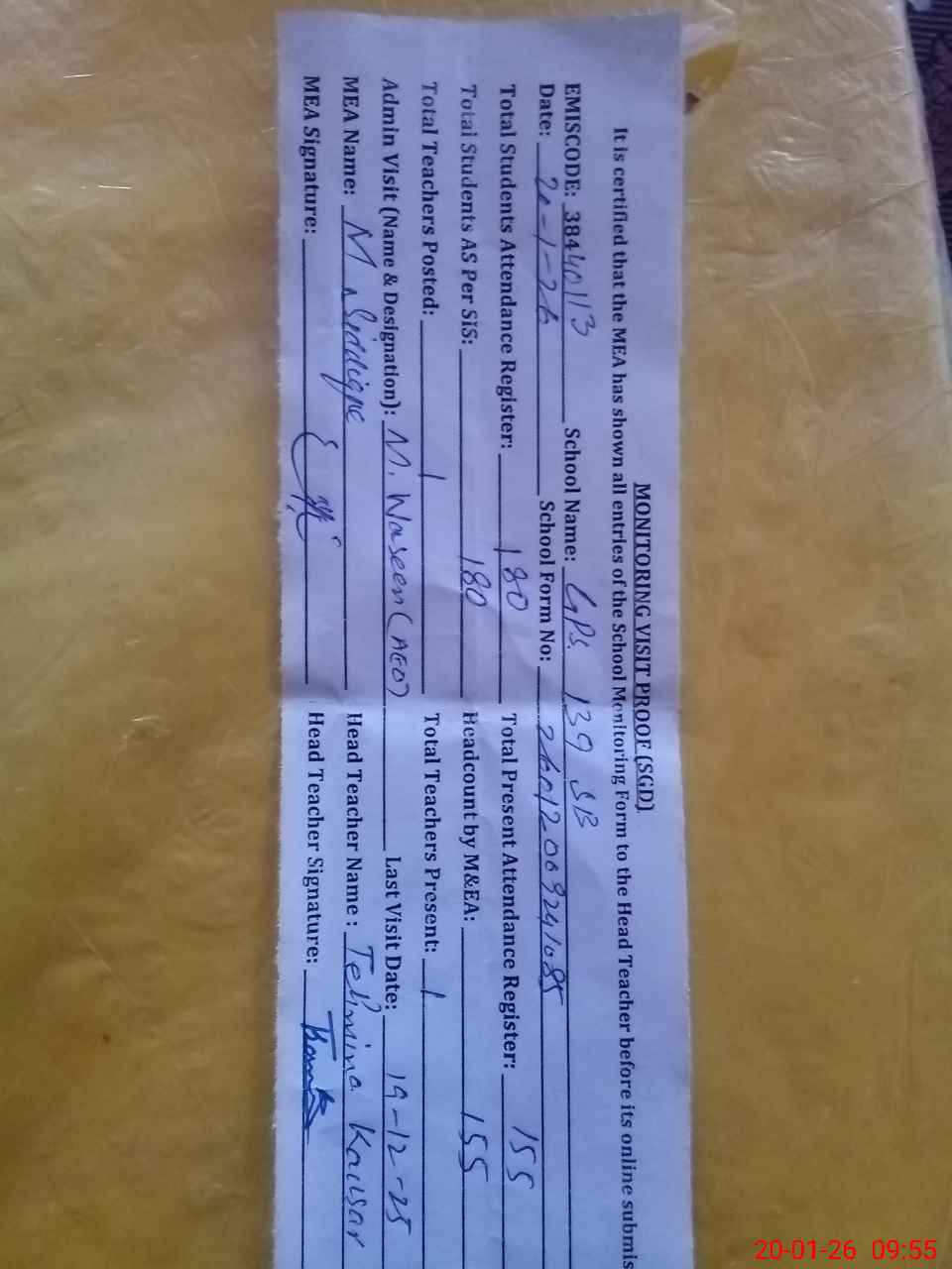 | Attendance Register | Head Teacher | MEA with School | Visit Proof |
