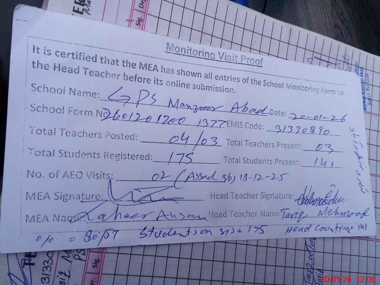 | EMIS Code: 31330890 | Name of School: GPS MANZOOR ABAD | |||