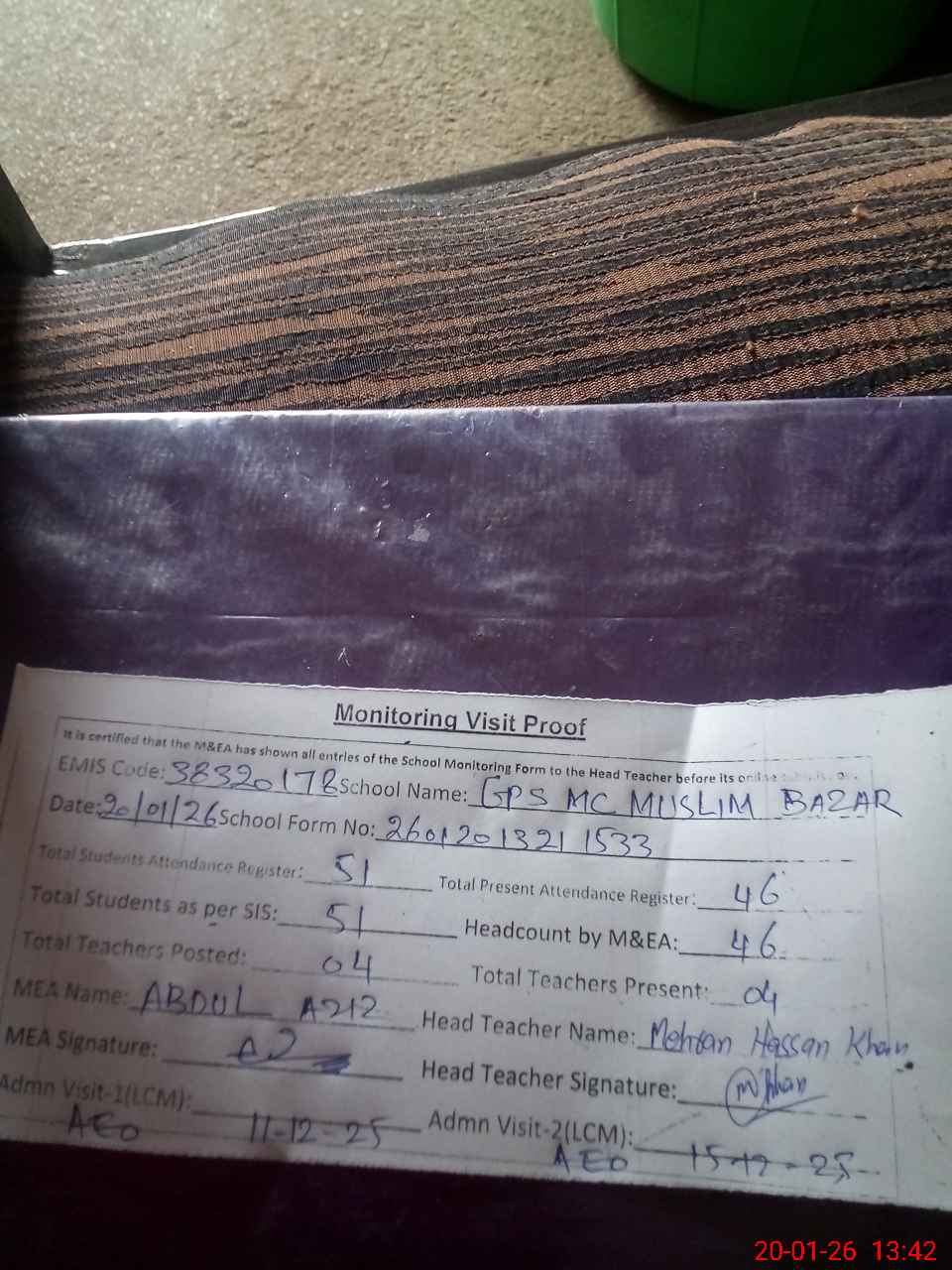 | Attendance Register | Head Teacher | MEA with School | Visit Proof |
