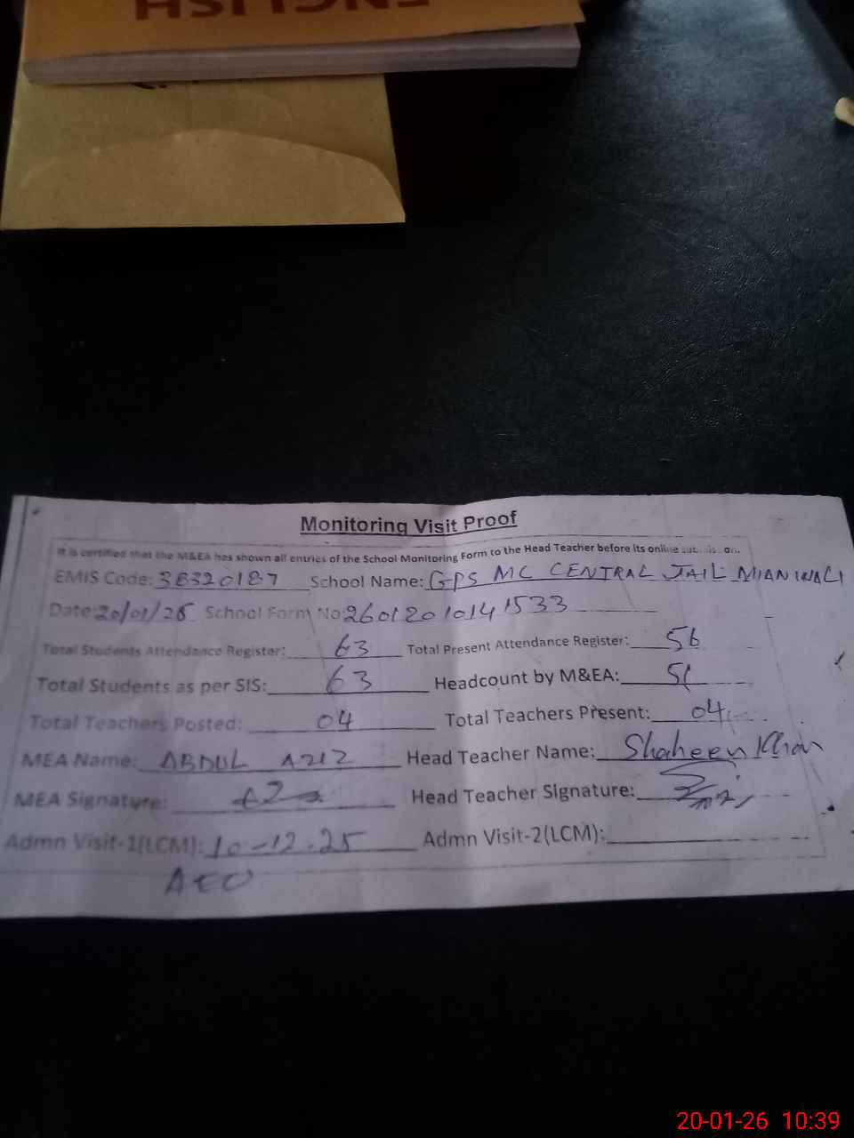 | Attendance Register | Head Teacher | MEA with School | Visit Proof |