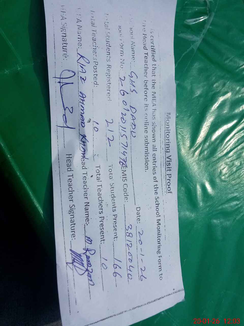 | Attendance Register | Head Teacher | MEA with School | Visit Proof |