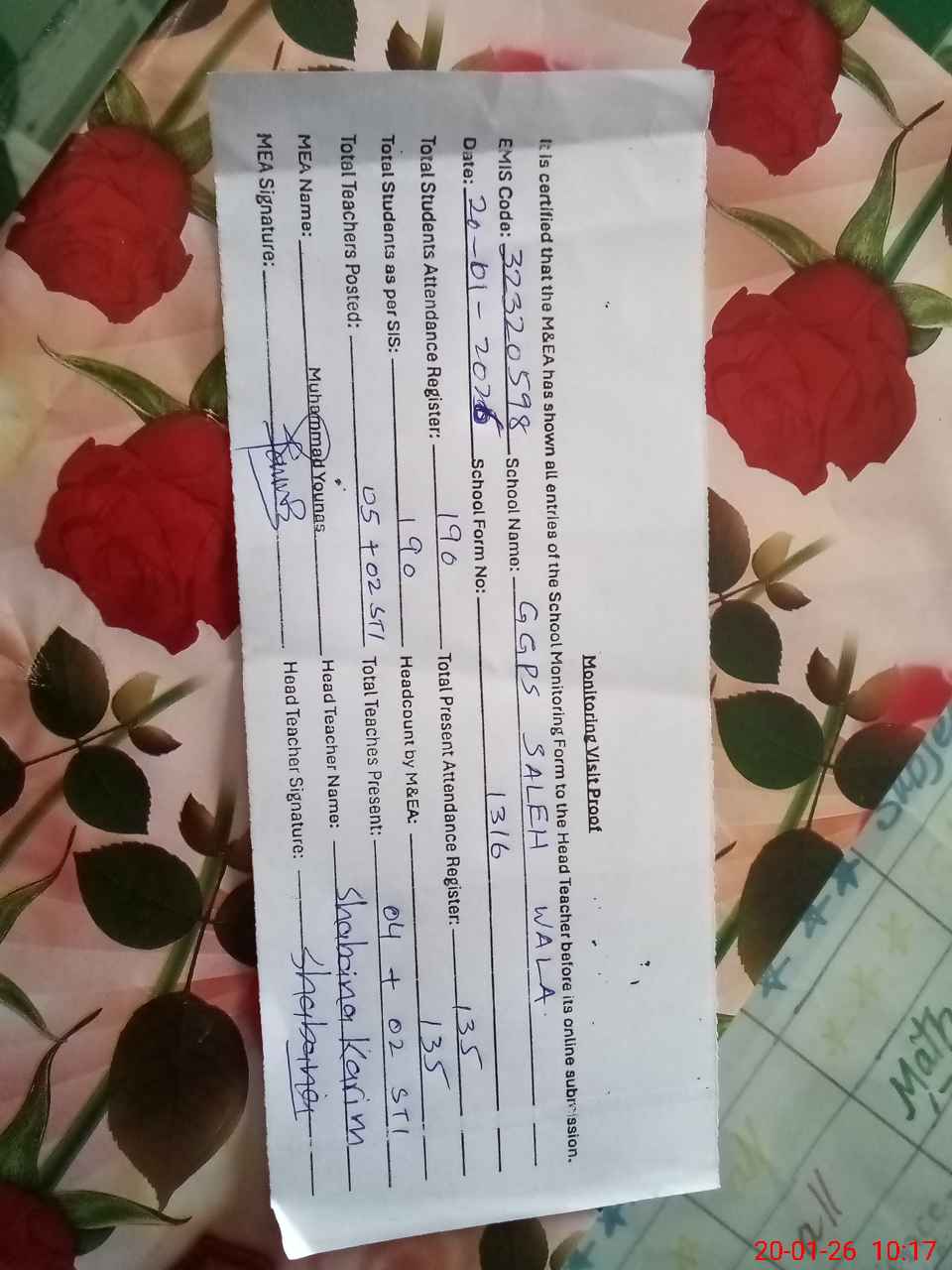 | EMIS Code: 32320598 | Name of School: GGPS SALEH WALA | |||
