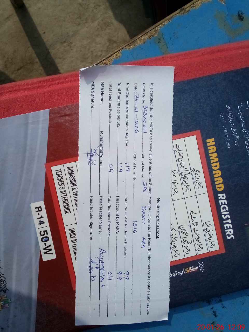 | Attendance Register | Head Teacher | MEA with School | Visit Proof |