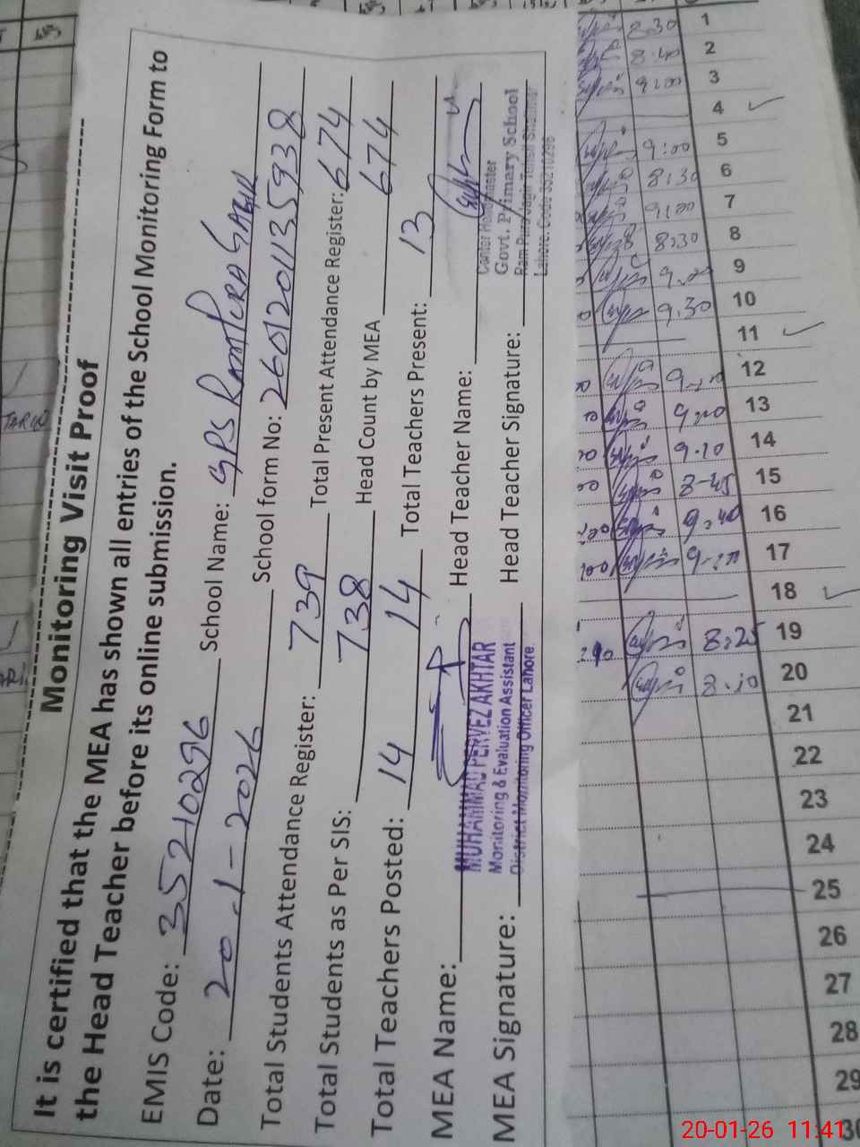 | Attendance Register | Head Teacher | MEA with School | Visit Proof |